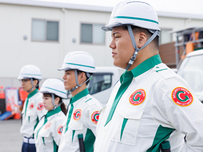 また、警察官や海上保安官と区別できるよう制服に標章を付けることも規定されています。警備業法で決められた大きさの標章を、「胸」と「腕上部」の2カ所に取り付けなければなりません。(グリーン警備では頭文字の「G」を形どった標章となっています。