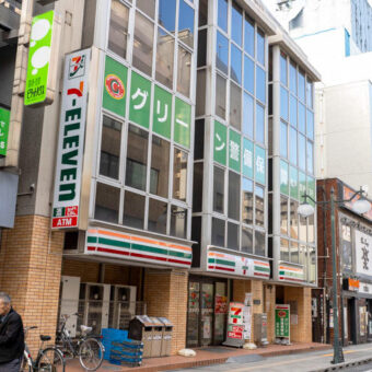 少し進むと右手に、松戸支社が入る芹澤ビルが見えてきます。1階の「セブン-イレブン」と、上階の大きな緑色の看板が目印です。